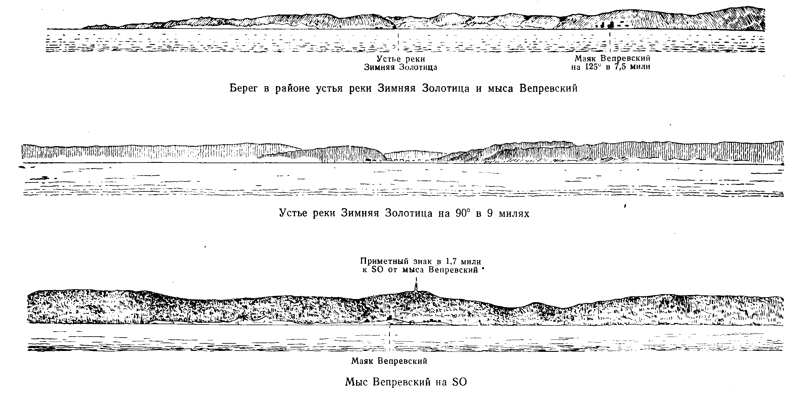Зимняя Золотица. Берег в районе реки Зимняя Золотица и мыса Вепревский; Устье реки Зимняя Золотица на 90° в 9 милях; Мыс Вепревский на SO (рис., 67